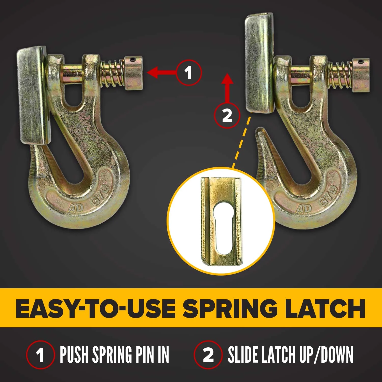 The clevis attachment provides reliable attachments to chain and other accessories (and fast replacement if the hook becomes damaged). To move the latch up or down, all you have to do is push the spring-loaded end of the clevis hook.