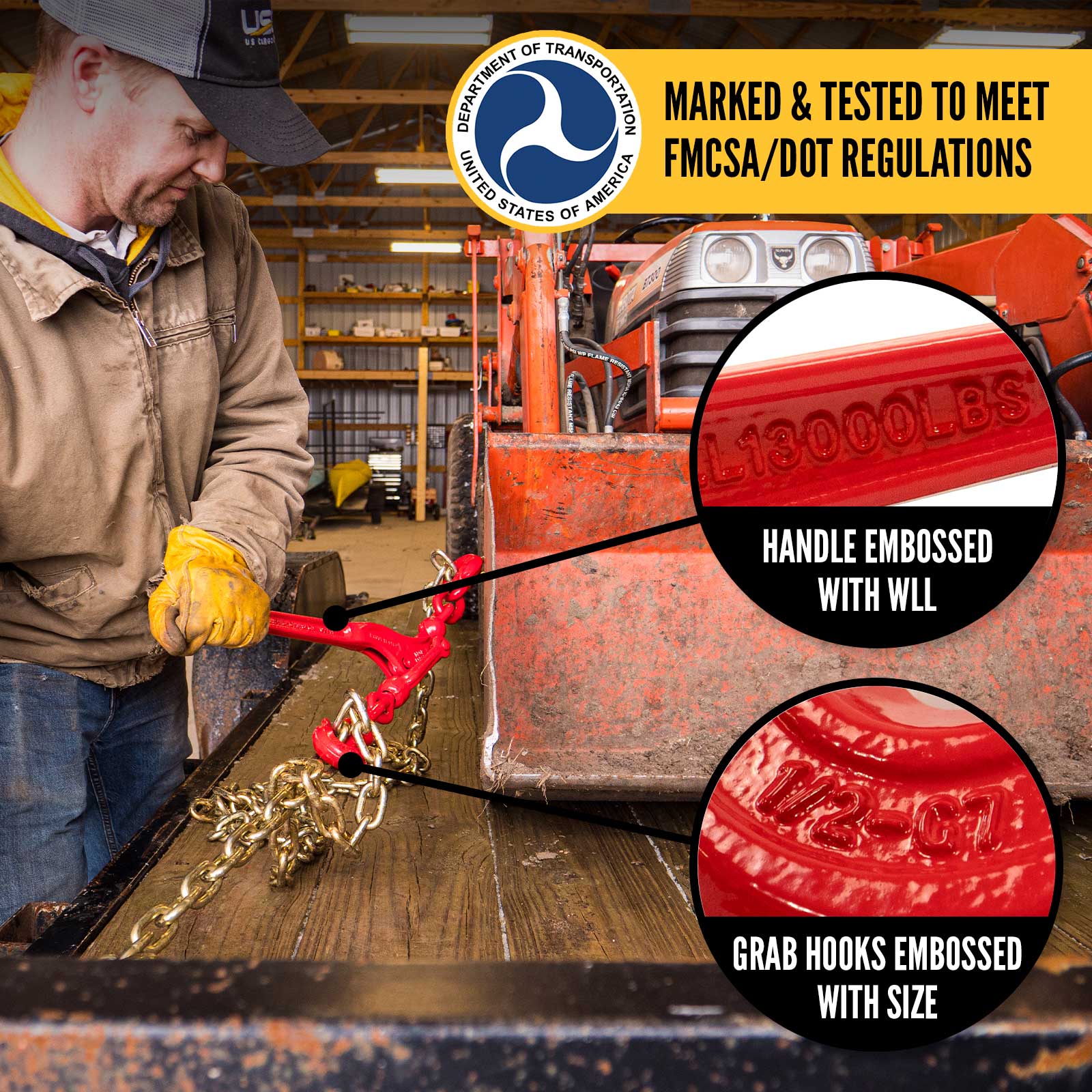 All of our chain binders are FMCSA / DOT compliant and meet or exceed WSTDA T-6 Recommended Standards. The working load limit and traceability code are embossed on the handle / body and the hooks have grade and size markings. This ensures quick identifications and stress-free inspections.