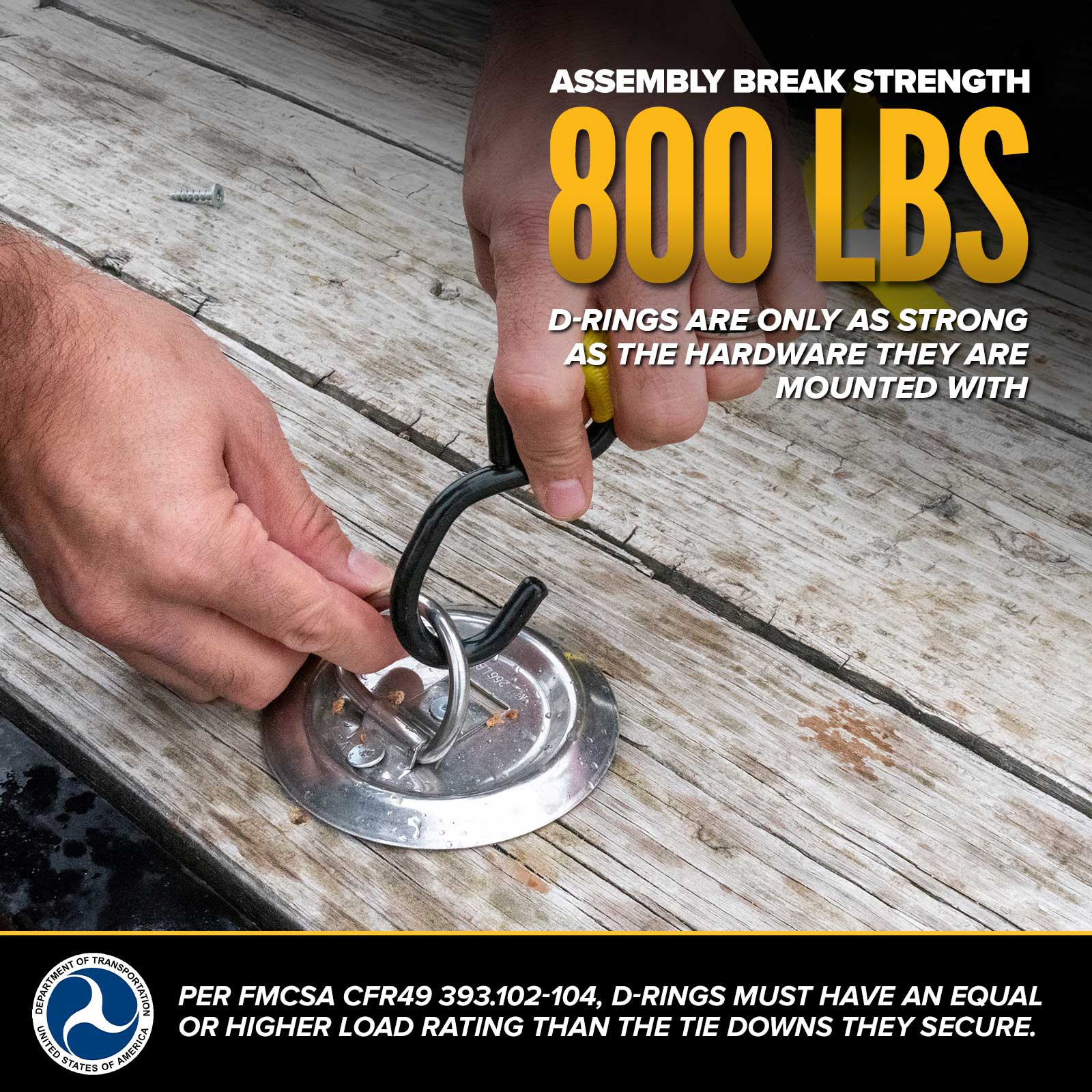 - Cargo weight and tie down type go hand-in-hand - you will choose your tie downs based on what cargo you are hauling. According to the FMCSA CFR49 sections 393.102-104, anchor points must be at least as strong as the tie down they are attached to. In other words, you want the D-ring to have an equivalent or higher load rating than your tie down.