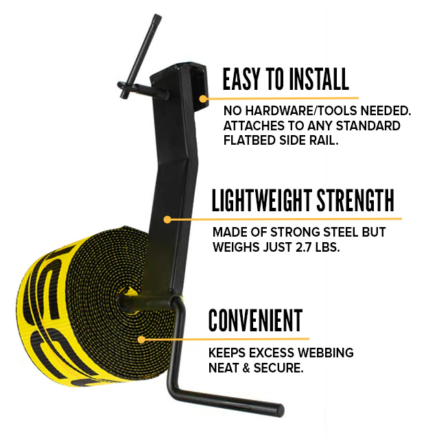 This Strap Winder is a handy tool for any flatbed hauler. The flatbed strap winder easily attaches to any standard side rail on a flatbed and keeps your excess winch strap neat and secure. The flatbed trailer strap winder is painted with a durable black finish and is in stock and ready to deliver.
