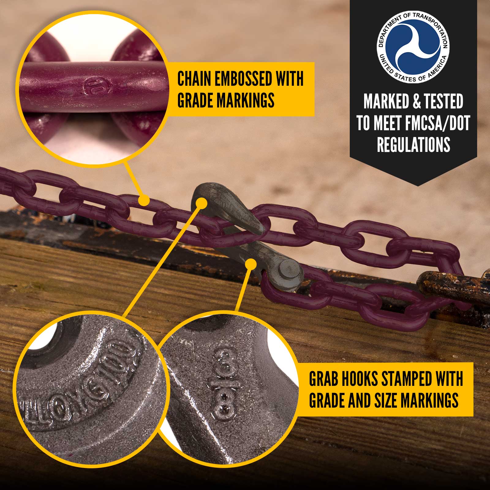 All of our tie down chain is DOT compliant and meets or exceeds FMCSA CFR49 Section 393.104 and NACM Welded Steel Chain Specifications. The hooks are embossed with the size and the grade, and the chain has grade embossing on the back of each link. They are also stamped with the manufacturer and grade every 12". This ensures you can quickly identify the chain you need, and that inspections are stress-free.