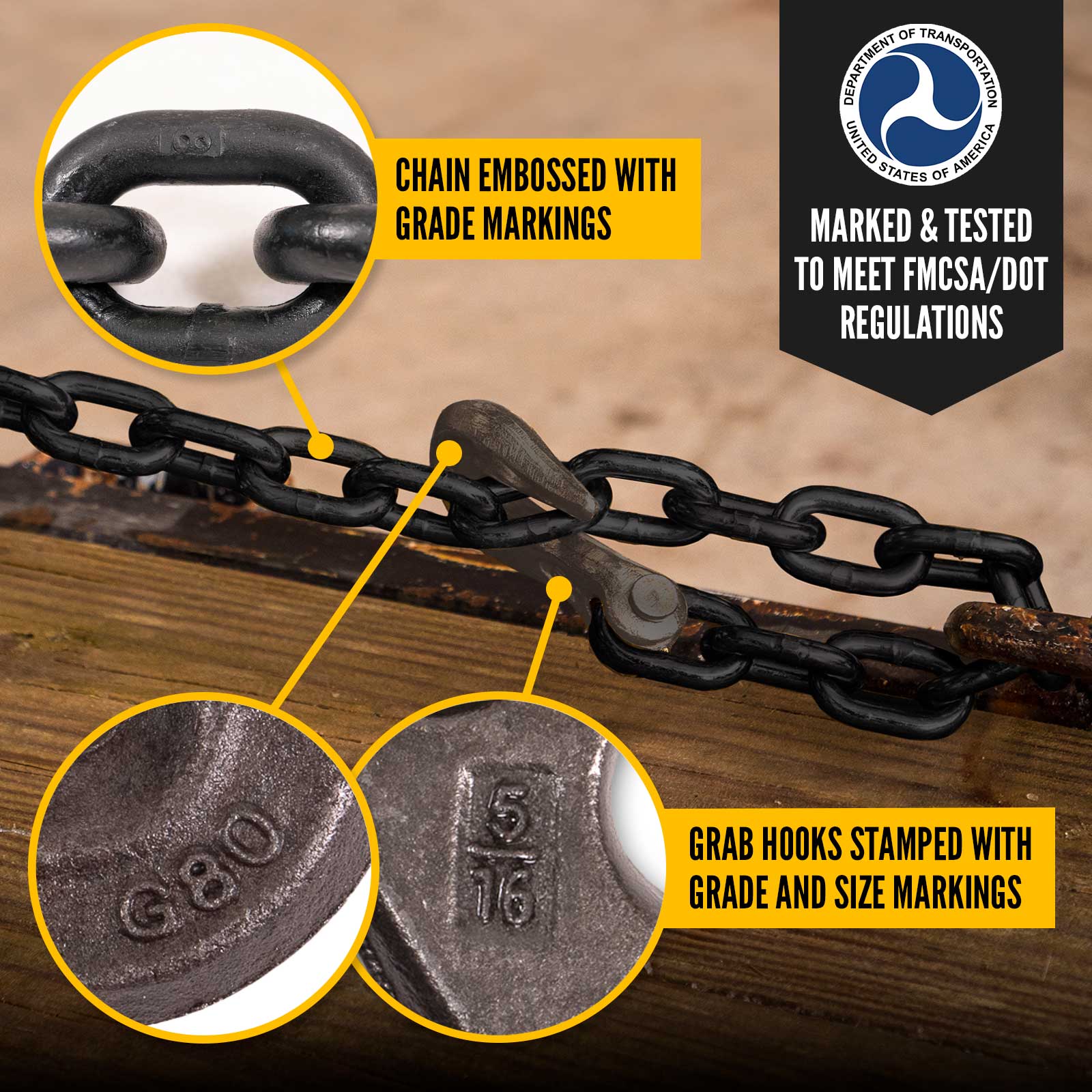 All of our tie down chain is DOT compliant and meets or exceeds FMCSA CFR49 Section 393.104 and NACM Welded Steel Chain Specifications. The hooks are embossed with the size and the grade, and the chain has grade embossing on the links every 3 feet. This ensures you can quickly identify the chain you need, and that inspections are stress-free.