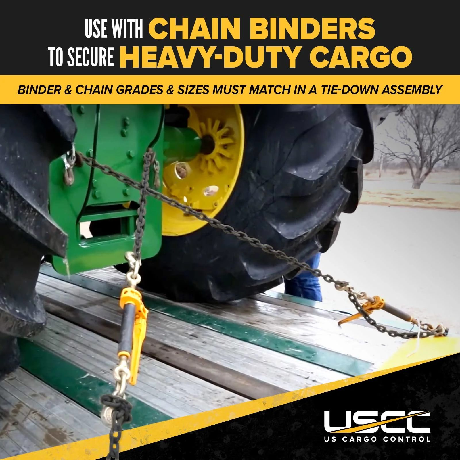 The clevis grab hooks on each end have a non-cradle design that allow them to fit through a flatbed trailer rub rail for quick yet secure connections, and the shallow throat opening lets you easily connect to chain. The cotter pin means you can replace damaged hooks with little hassle.